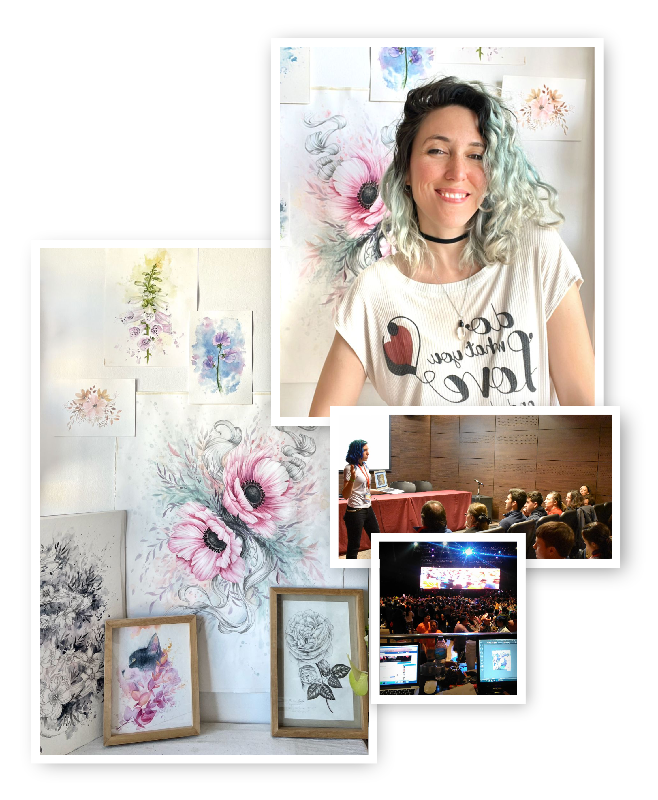 Llevo más de 20 años ilustrando. 10 años como profesional diseñadora gráfica recibida en la UBA. 6 años como maestra y me especializo en el arte botánico, en la exploración de las plantas, en mirar a la madre naturaleza con ojos llenos de magia y disfruto mucho ayudando a otras personas a lograr plasmar la belleza de las flores en hermosas obras de acuarela.